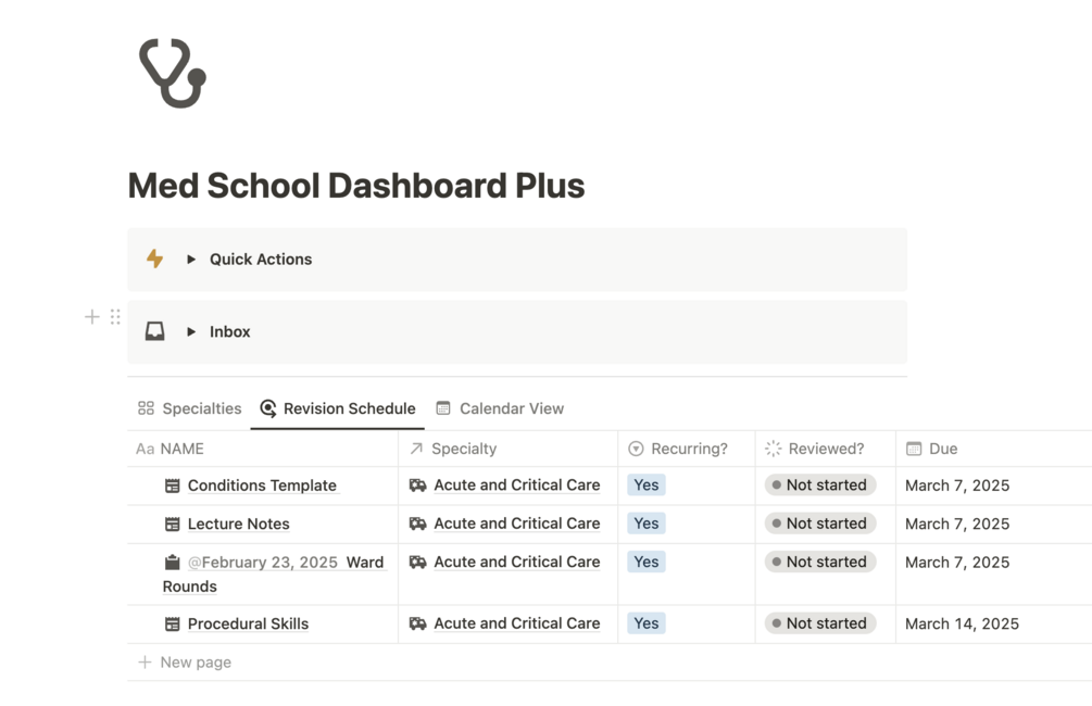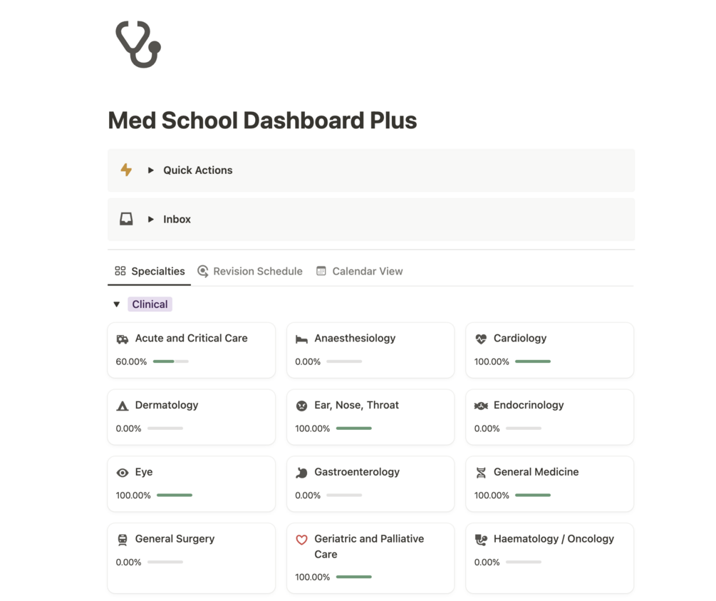 Building on the versatile, structured, and intuitive design of the free Medical School Dashboard, Medical School Dashboard Plus takes efficiency one step further by integrating an intelligent spaced repetition system. This ensures that crucial clinical knowledge stays in your long-term memory, so you’re always prepared—whether you’re revising for exams, presenting cases during ward rounds, or getting quizzed by seniors.
